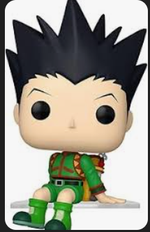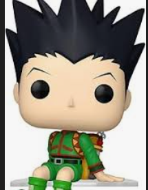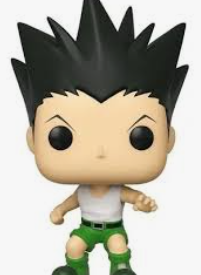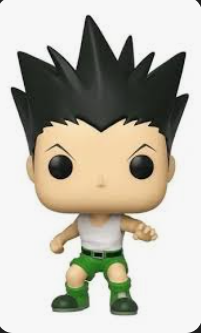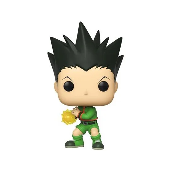Figura colecionável tridimensional produzida em vinil, pertencente à linha Funko Pop!, representando o personagem fictício Gon Freecss, da obra Hunter × Hunter. O objeto apresenta linguagem visual padronizada característica dessa tipologia de colecionáveis contemporâneos, marcada pela estilização do tipo “chibi”, com cabeça de proporções ampliadas em relação ao corpo, membros curtos e feições faciais simplificadas.